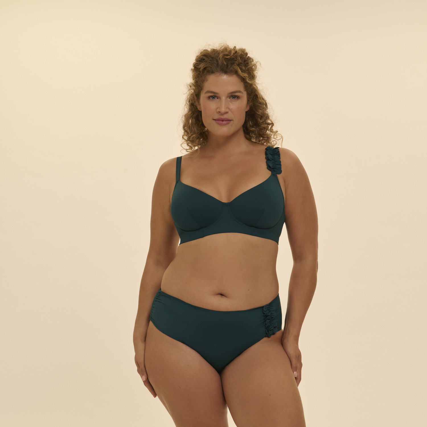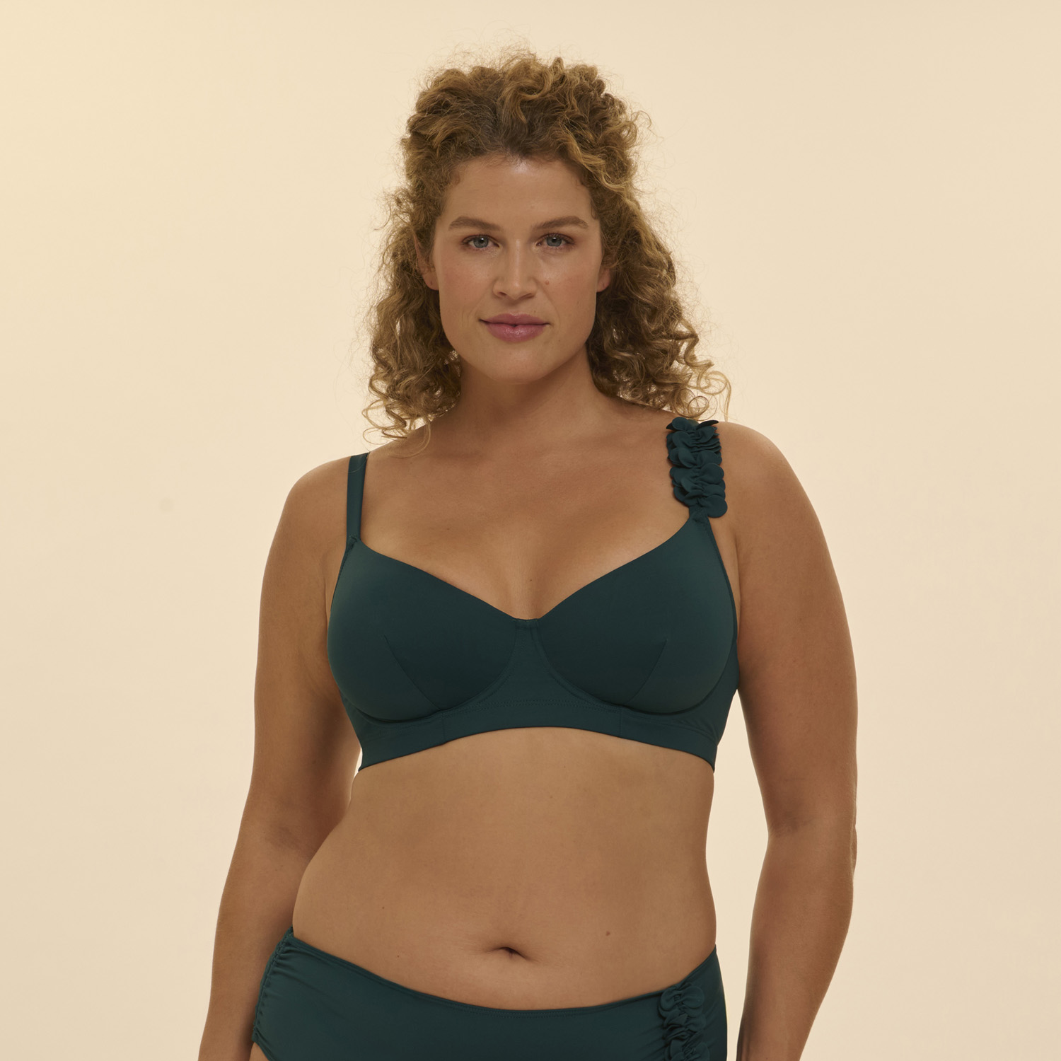 Elegancka i zmysłowa linia kostiumów kąpielowych Paloma w jednolitym kolorze, ozdobiona subtelnym pasem kwiatów wycinanych w technologii ultradźwiękowej.